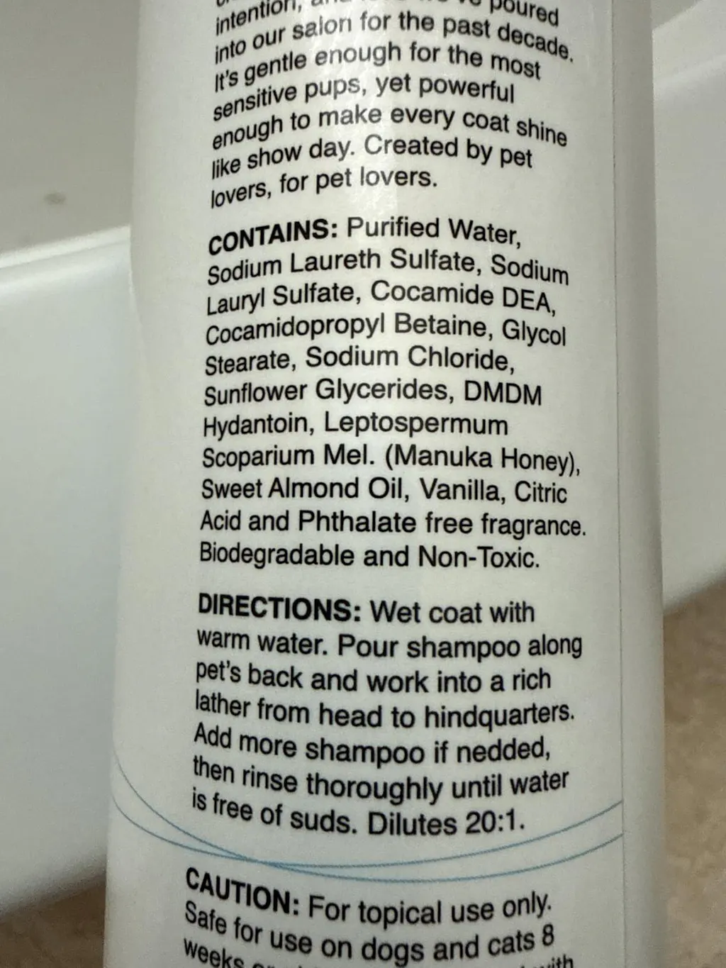 My German Shepherd was ok with this dog shampoo. She was very happy its made in the United States and not imported.Unlike the imported brands that cautioned against using on Humans, my dog thought if it was not safe for humans, then why would a human want to use an imported dog shampoo on his dog?Anyway, the aroma is incredible.The feel of the shampoo is good.It rinses off nicely.This is a 20:1 ratio, so dilute the shampoo first.Overall, this dog shampoo works well.